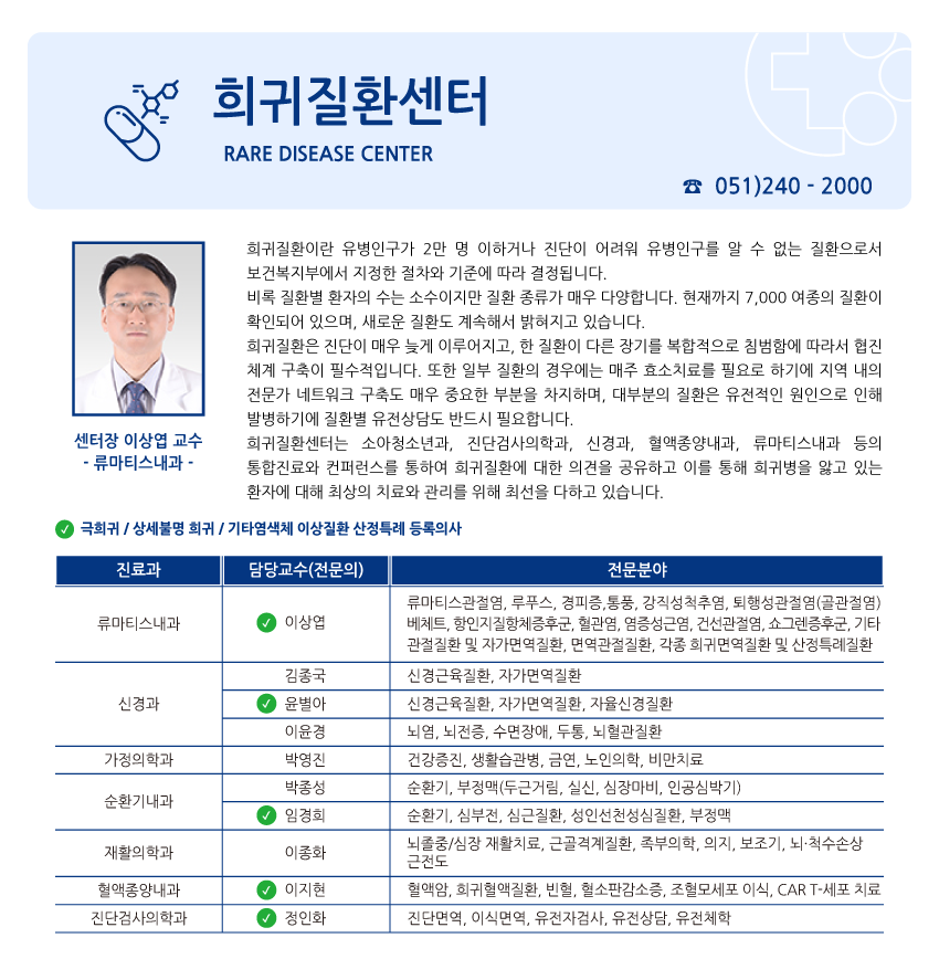 진단면역, 이식면역, 분자유전, 유전자검사, 유전상담 * 화오후 : 유방센터 진료 (2,4주) * 목오후 : 어린이센터 진료 (2,4주) |
