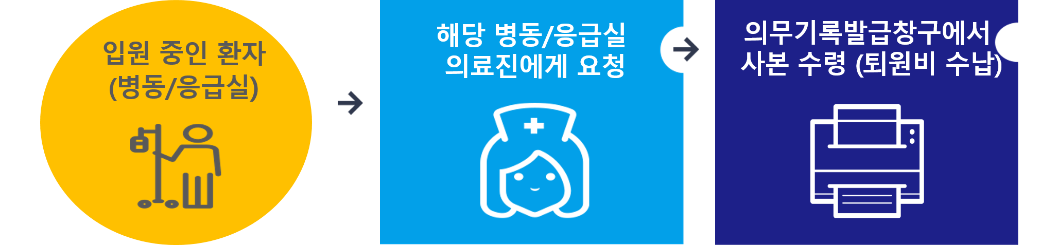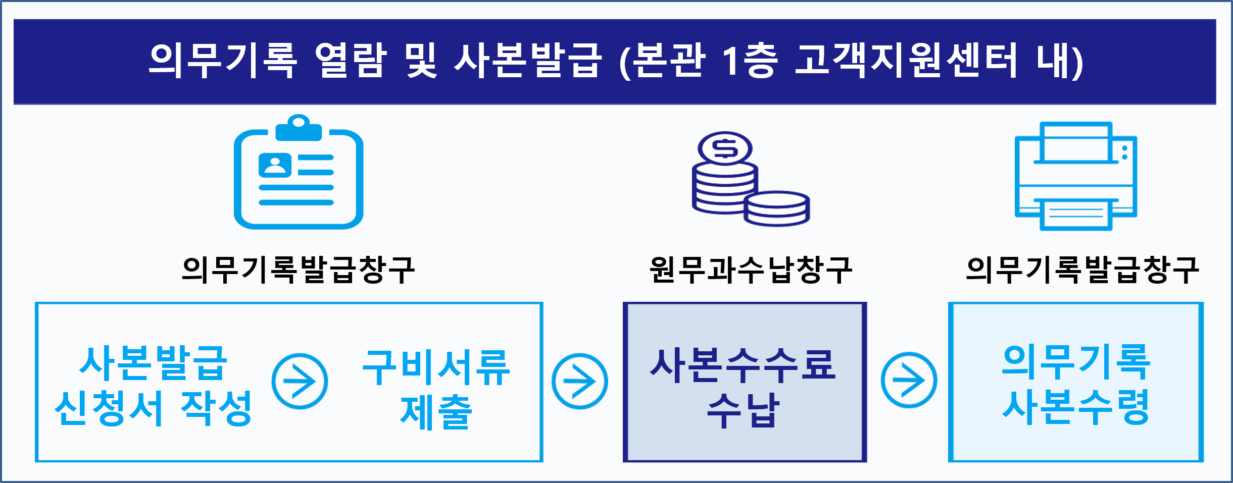 의무기록 사본 발급은 해당 서류를 지참하고 본관 1층 고객지원센터 내 의무기록발급창구에 방문 신청 후 발급 받으실 수 있습니다.