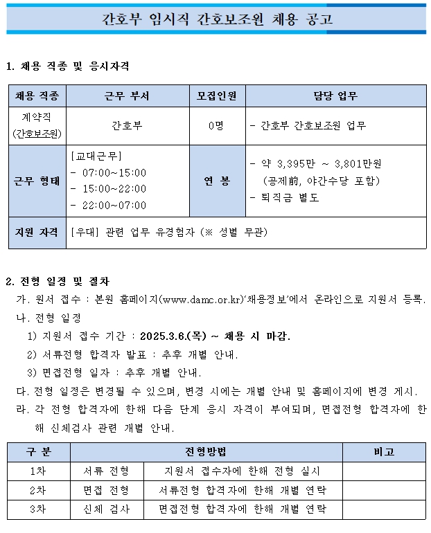 간호부 임시직 간호보조원 채용 공고