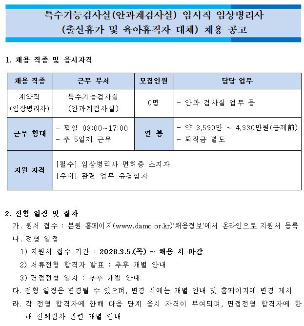 특수기능검사실(안과계검사실) 임시직 임상병리사(출산휴가 및 육아휴직자 대체) 공개채용 공고